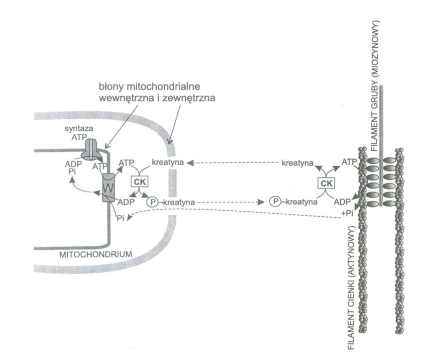 W mitochondrium, w przestrzeni między błonowej istnieją dwie izoformy enzymu kinazy kreatynowej: pierwsza to ubikwitynowe mitochondrialne CK (CKum) oraz mięśniowe mitochondrialne CK (CKm). Ponadto w komórce, w cytozolu występuje kinaza kreatynowa ułatwiająca przebieg procesów wymagających znacznych ilości ATP, takich jak skurcz mięśniowy (CKa), kinaza kreatynowa utrzymująca homeostazę ATP/ADP (CKc) oraz kinaza kreatynowa (CKg) sprzęgająca glikolizę z syntezą PCr. Izoenzymy kinazy kreatynowej zawartej w mitochondriom są wspólnie nazywane mitochondrialną kinazą kreatynową (CKm), natomiast kinazy kreatynowe występujące w cytozolu CKa, CKc oraz CKg są nazywane wspólnie cytozolową CK, gdyż są one tą samą izoformą enzymu CK, ale spełniającą w cytozolu różne funkcje. Mitochondrialne CK umożliwia wbudowanie powstałego z fosforylacji oksydacyjnej ATP w kreatynę, a powstająca fosfokreatyna transportowana jest przez pory białkowe w zewnętrznej błonie mitochondrialnej do cytozolu, gdzie zostaje wykorzystana do tworzenia pozamitochondralnego ATP, głównie w okolicy mostków aktyno miozynowych włókna mięśniowego [Belister, 1939; Bessman, 1981; Bessman, 1990]. W reakcjach pozamitochondrialnego „odzyskania” ATP do skurczu mięśniowego z PCr bierze udział cytozolowa CK (CKa) (ryc. 2).